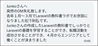 「Junkoさんの作成したLaravelの教科書でしっかりとLaravelの基礎を学習することができ、転職活動を成功させることができました。4月からエンジニアとして働くことが決まりました」 (オザキ様)